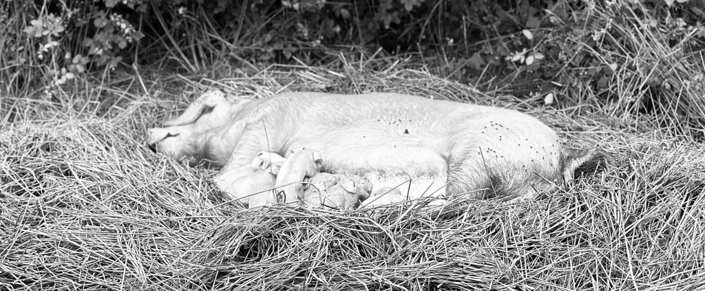 We aim for each sow to have between 1-2 litters per year. They enjoy making their own nests in the moor grasses and are excellent mothers producing some very cute piglets! The piglets stay with their mums until around 8-10 weeks old. By this time the piglets are independent, confident and weaned. The weaners are kept together as a drove until around 9 months old. We then take them to our local abattoir for slaughter. Our local skilled butcher produces the pork you will find for sale at Moor Taw honesty shop shed.